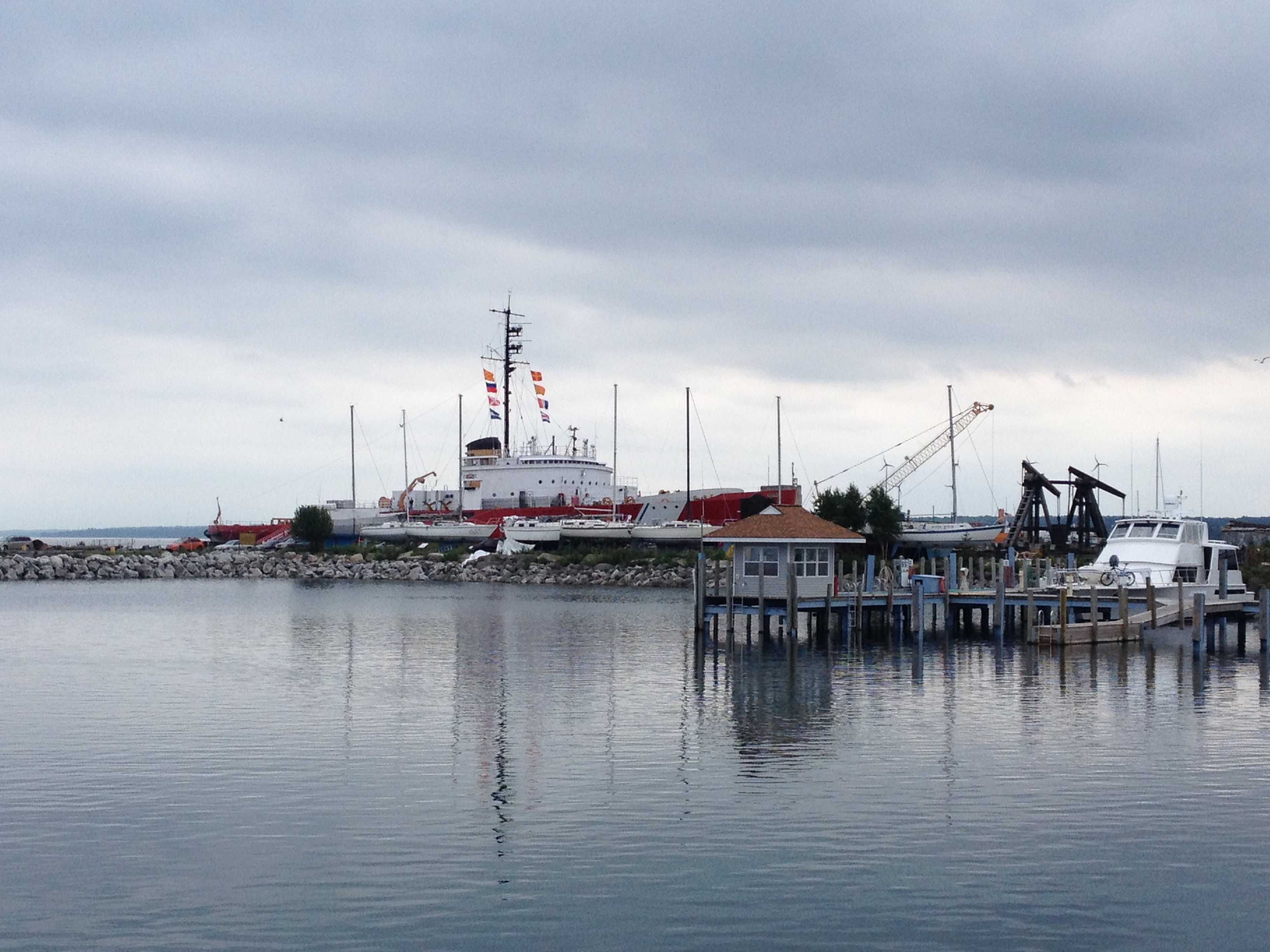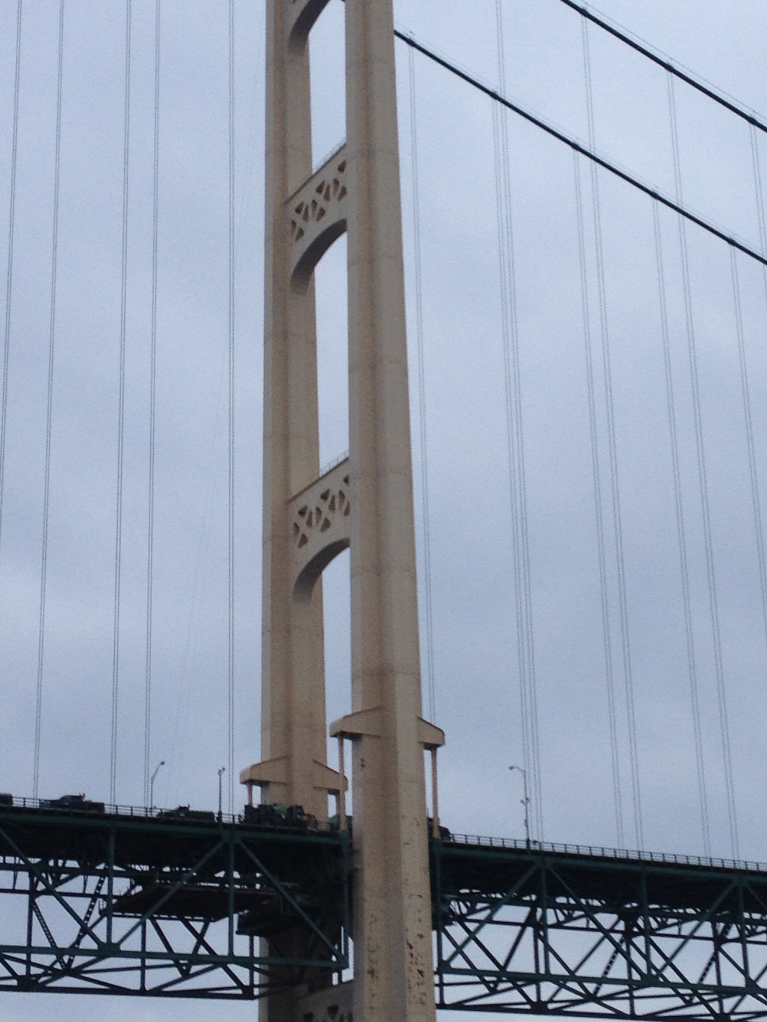 The cars and semis passing overhead looked more like Matchbox cars two hundred feet above us. Our cruise host from the Great Lakes Lighthouse Keepers Association described the engineer and this new kind of suspension bridge which is really anchored in huge cement caissons in the water.