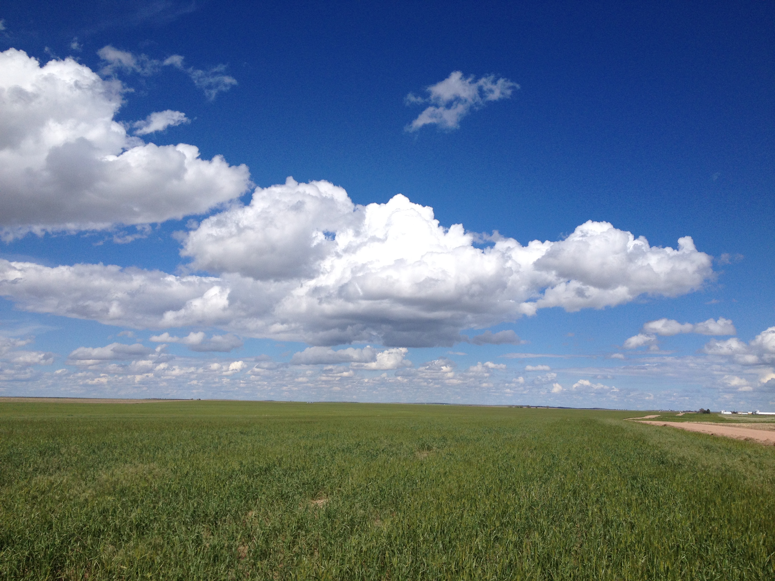 The sky has been the most amazing color of brilliant blue today, with big huge puffy white clouds, their bellies painted silver. Sunday we had a gully washer with hail. It stripped most of my choke cherries and crab apples and did some damage to the wheat. But today was so incredibly beautiful.