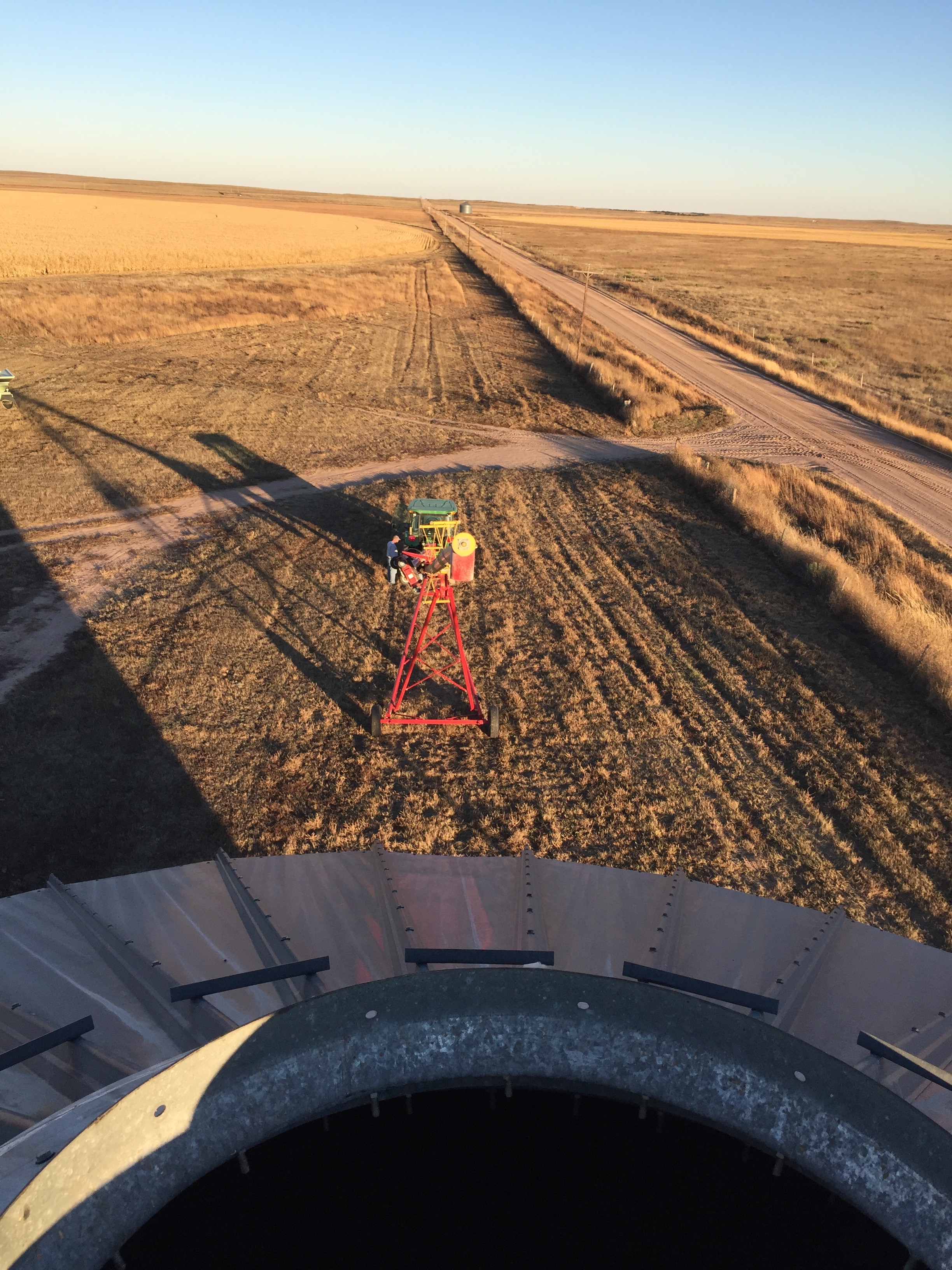 Move everything to the next field and climb the grain bin to open the top for the unloading auger to be set. The whole world is before you up there, and I never could resist leaning down with my head in the empty bin to sing and laugh at the echo that comes up out of that big empty space. It’s magic.