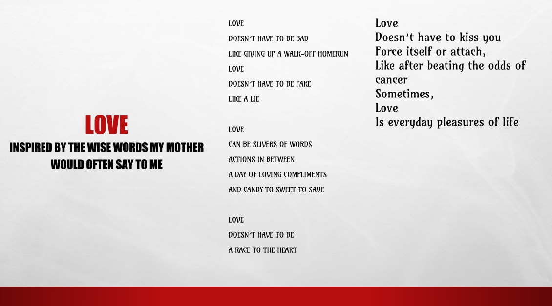 Sitting in my classroom after school yesterday, I was paging through poetry projects when another teacher came in. She had a question, but was pulled in by what she saw on my computer screen. I read a couple of poems to her and she wanted to know how I got my students to write like that. I give them models. I read them poetry that I love. I tell them to use the models but to write about what they know, about what is in their hearts,