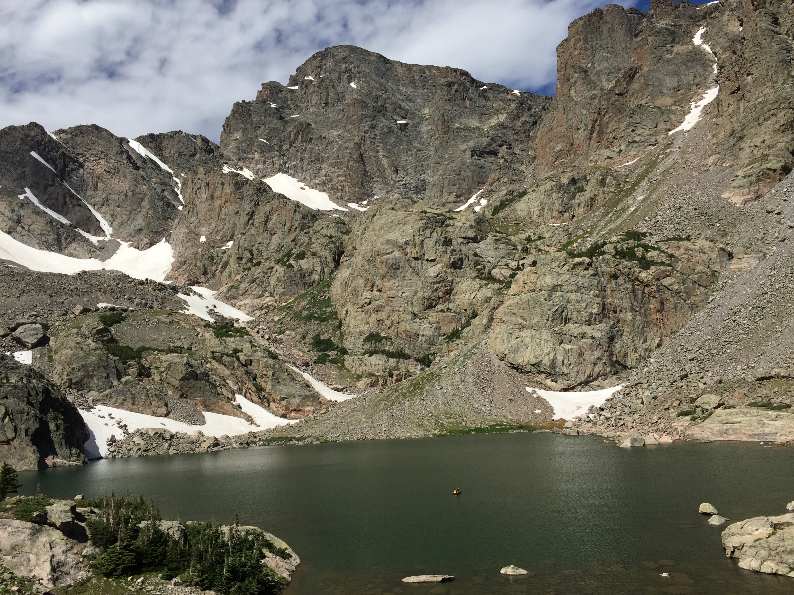 The first lake we came to on this trail was The Loch and several fishers were already hard at work in this lovely and long lake. Continuing along our path to Sky Pond, we hiked by so many waterfalls, clumps of columbine, chiming bells, asters, wild onion, penstamon, bottle brush, and so many other