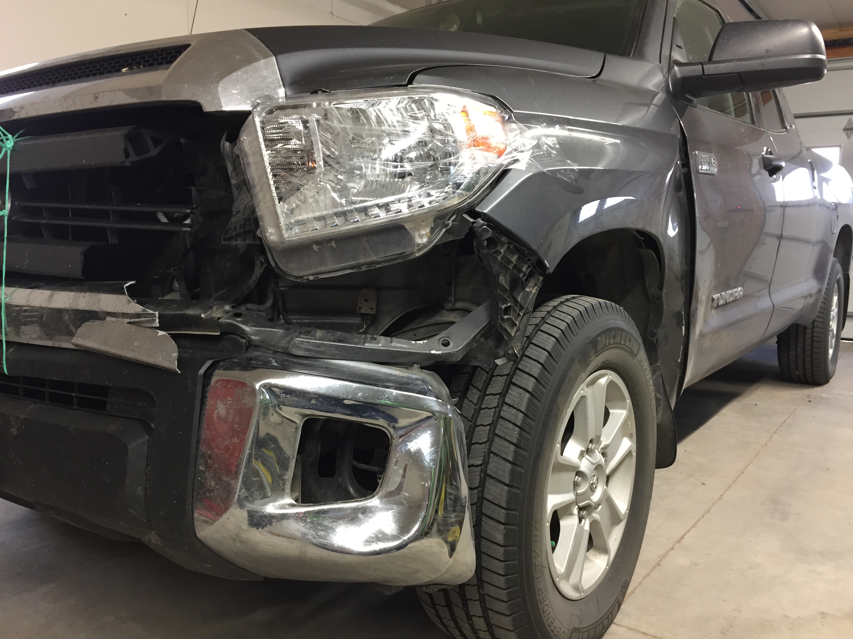 It took me a few minutes to get slowed down and get my pick-up off on the shoulder. I heard noises I knew where not good and struggled to be able to turn the steering wheel. Once I was stopped, I had to use both feet and the strength of my legs to push the driver door open enough to be able to get out. My driver side headlight was hanging down by the fender which was bent back into my tire, hence the noise and the burning smell. I made the mistake of trying to grab the fender with my bare hands to try to pull it back from the tire. It was hot!