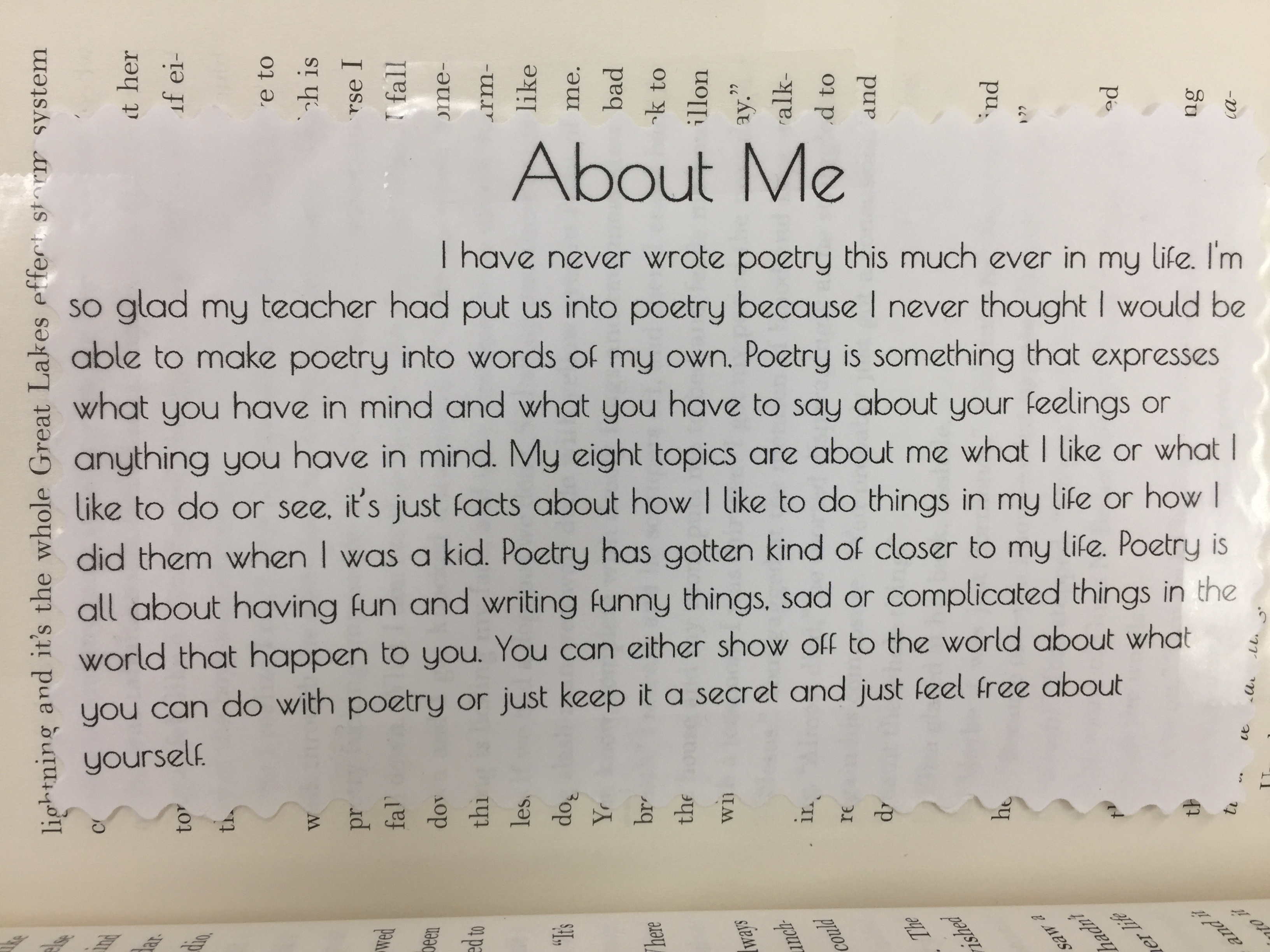 The unit culminated in a poetry project. They had to create an anthology of their poems and present them in some creative way: a Google slides presentation, or a magazine format, or a poster, or an