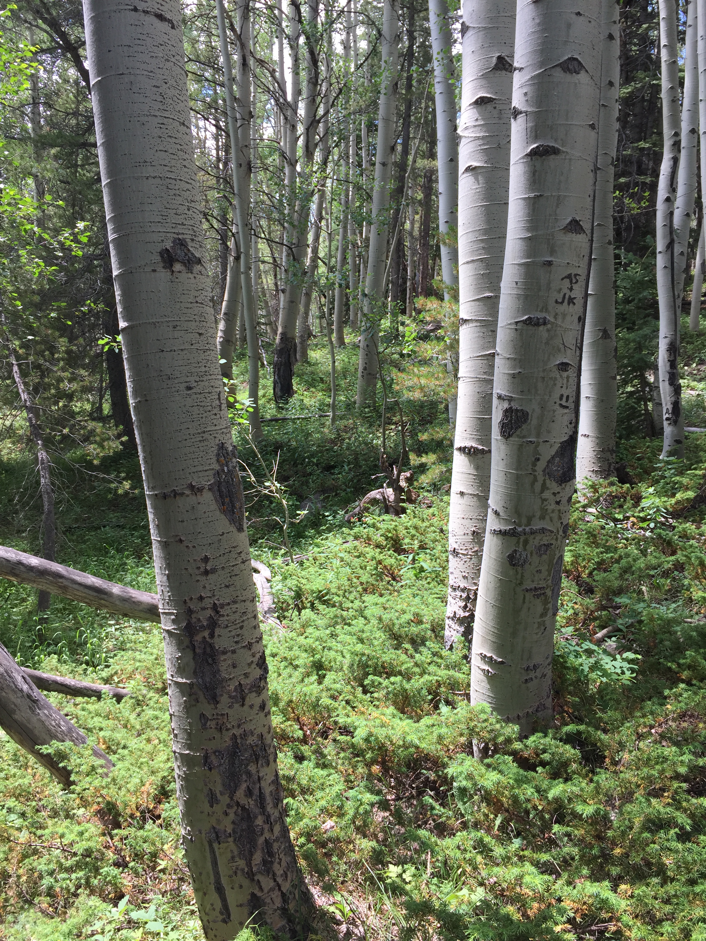 storms, and the afternoon “crowds.” Hiking through aspen groves that always brought me this amazing sense of peace on rides, was just as strong this day. We crossed little rivulets of melting mountain snow and wandered through willows and stunted bristlecone pines to the last push out of tree line and up to our high point.