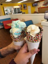 no matter what anyone says! We enjoyed a large herd of mountain goats and, late in the day, a mama and baby goat basking in the sun. The views were 360 degrees of “holy cow amazing,” and our bag lunch was hard-earned and eaten shivering out of the wind as best we could get. To cap off our first fall hike, well, the photo speaks for itself.