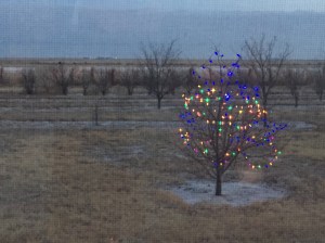 Moving my “office” to a window view has eased the strain on my eyes, allowing me to look out and away from my computer screen and into the world. Early morning means the lights are still shining on the tree, and I can just make out a rabbit curled up under the bird feeders.