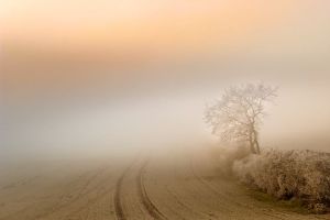 The fog settled just above the road. She could see her feet, but it was like they were disembodied from the world. It was the invisible man with feet. Cold clung in icy drops to her eyebrows and lashes. Taking off one wool mitten to see why her phone had stopped playing the novel she was listening to, she could feel the slick ice frozen to her nylon sleeves.