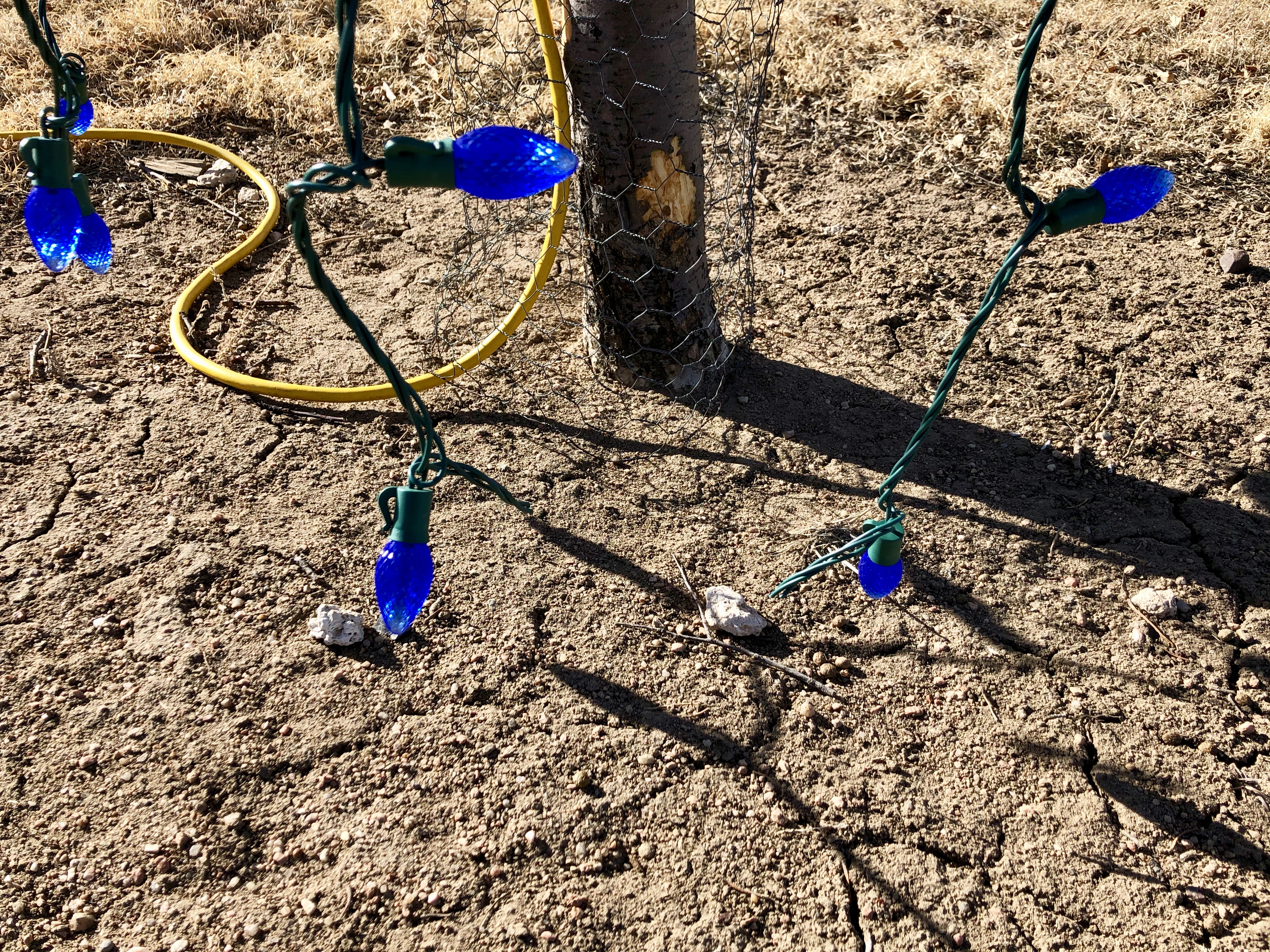 Turning to be sure the lights were still plugged into the extension cord from the tree, I see that my string of blue lights, my favorite lights, at the bottom of the tree have been sheered in half. The cute little bunnies are now irritating rabbit rodents. Where are the chicken hawks and owls? This is war.